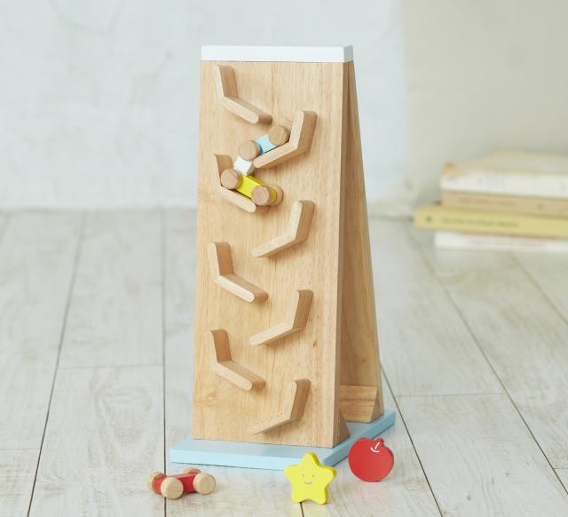 コツコツと奏でる木の音はリズミカルで楽しく、お子さまの好奇心を刺激し、車たちのダイナミックな動きは、目で追いかけて観察力を伸ばします。最初は遊びを手伝ってもらっていても、次第にスロープへの乗せ方を覚えていき、お子さまの成長を実感できる商品です。