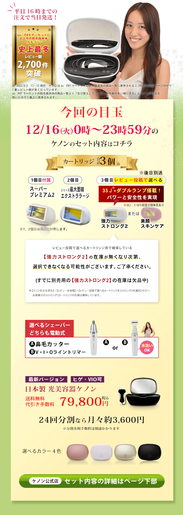 - ケノンの脱毛器の評判が良く購入しました。使い方も簡単で、これから効果が出るのが楽しみです!