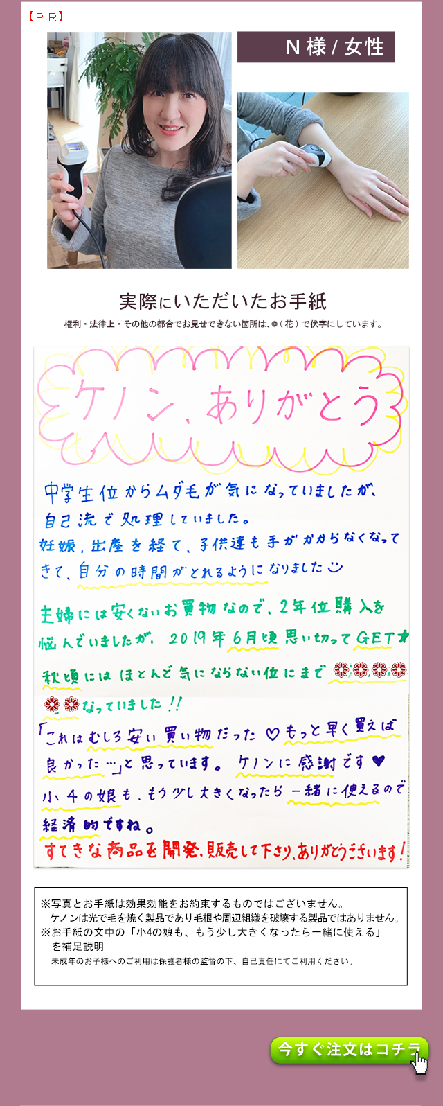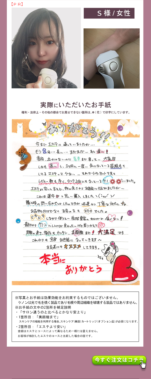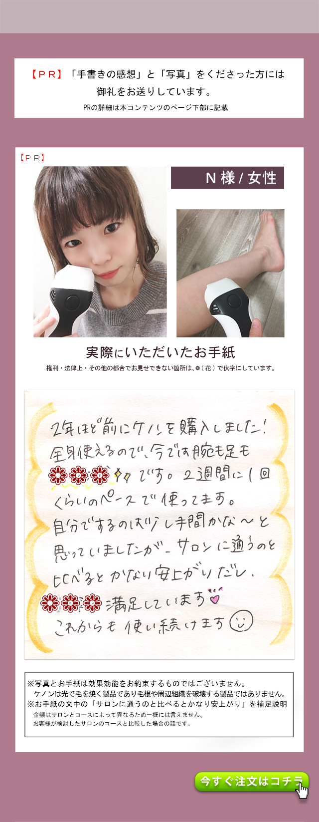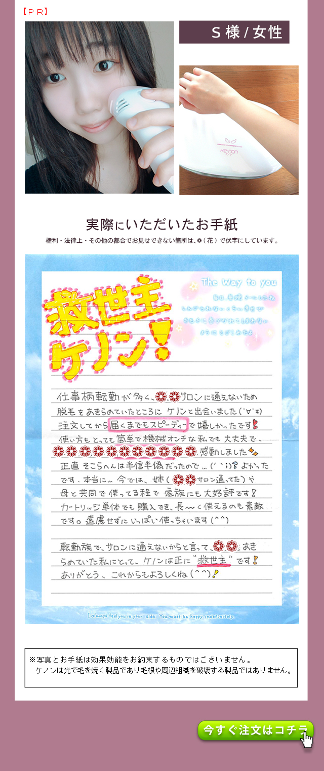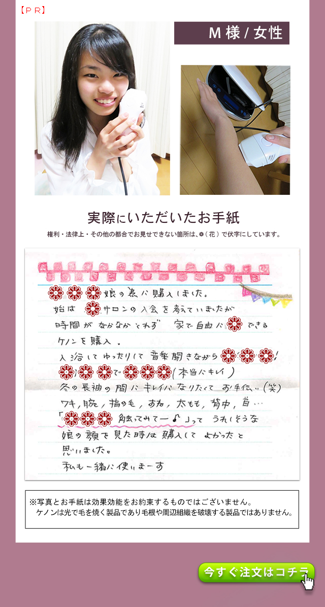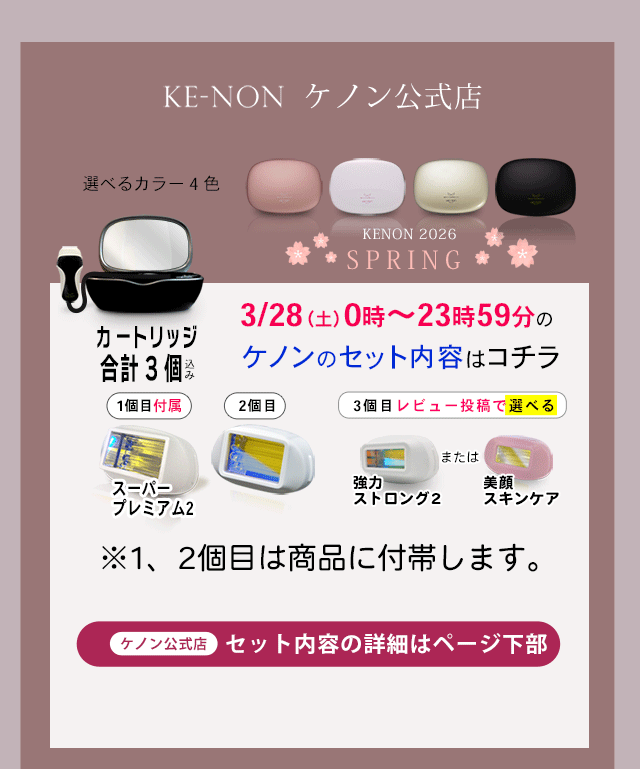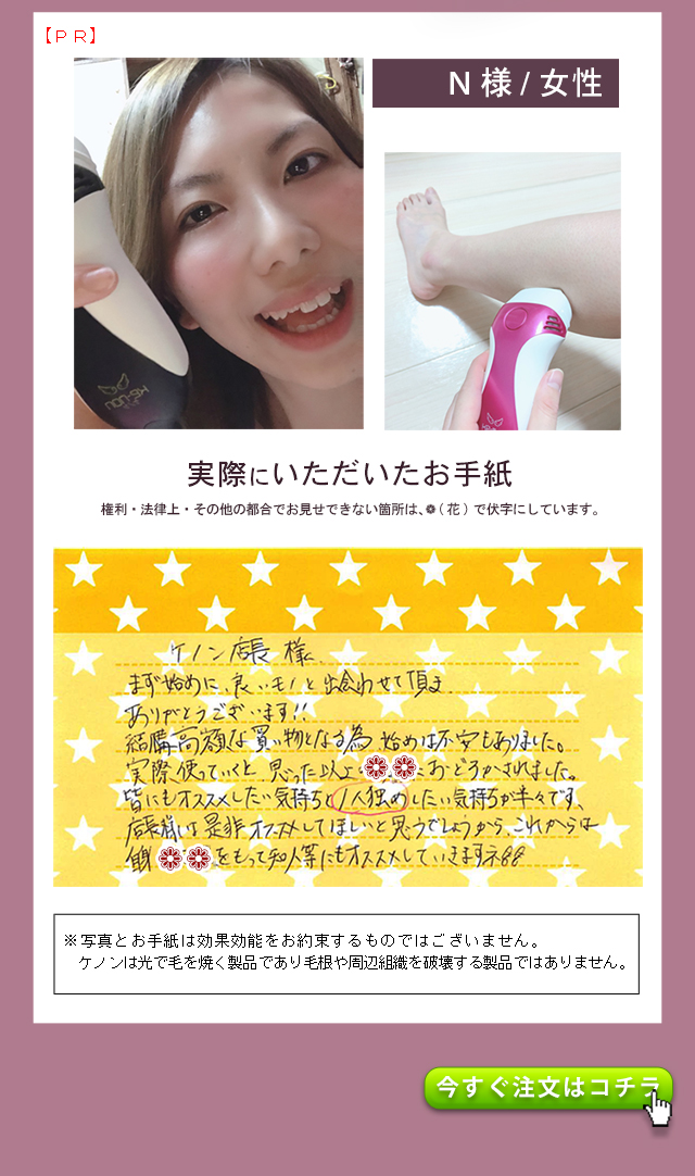 - 出荷番号 1008007660 1ヶ月と少し前に購入して、数回使用しましたが、大変満足しています。 過去に、エステでの光脱毛、クリニックでのレーザー脱毛を経験していますが、とにかく予約などが面倒で続きませんでした。 ケノンなら隙間時間に自分で納得いくまでできるので最高です。 何よりパワーが予想をはるかに上まわっており驚きました。 レーザーまでとはいきませんが、照射後一週間ほどで毛がポロポロと落ちて、その効果を実感しました。 他の家庭用脱毛器を購入したことはありませんが、ケノンを選び良かったと自分を褒めてあげたいです。 また、お店のレビューにも書きましたが、お電話した際、私の勘違いであったにも関わらず親切、丁寧に対応していただいた男性スタッフの方、本当にありがとうございました。 おかげさまで、大変気持ち良く買い物をすることができました。 本当にありがとうございました。 お店、商品ともにおすすめです。