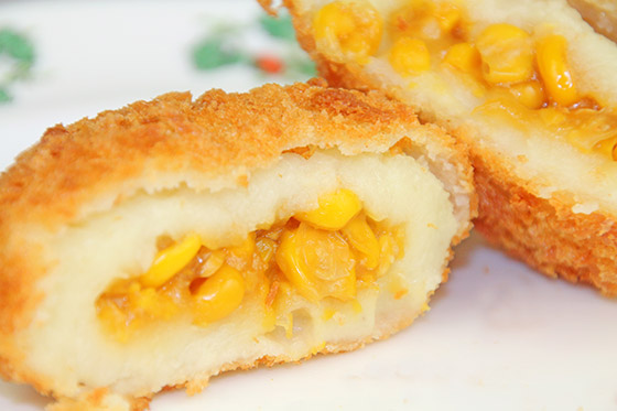 ちょっと大きめなコロッケですが、中には焼きもろこし味のコーンがギッシリと詰まったとても斬新で美味しいコロッケです。