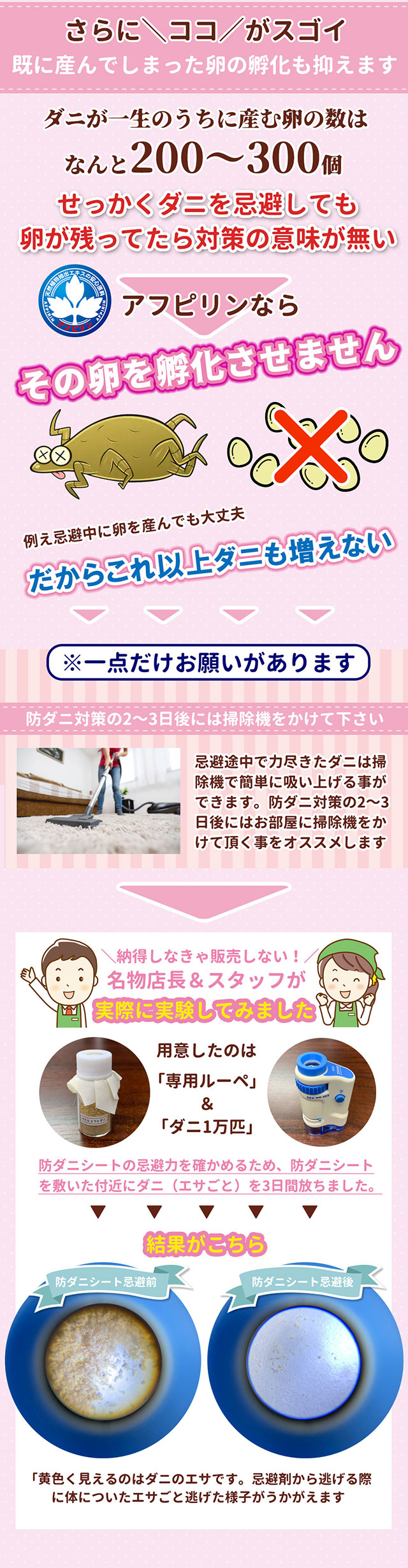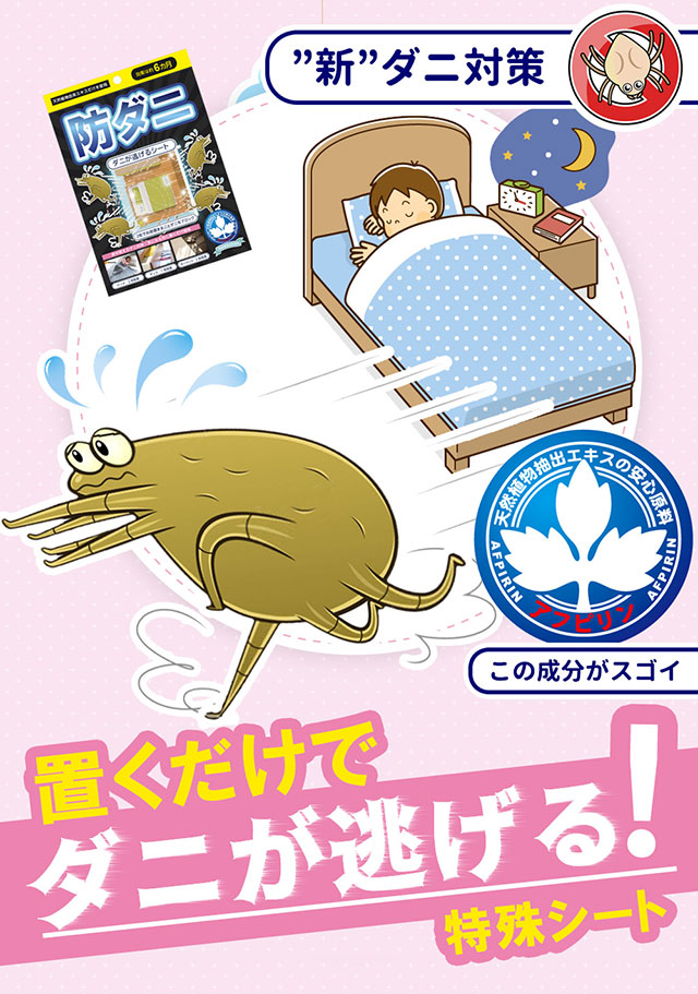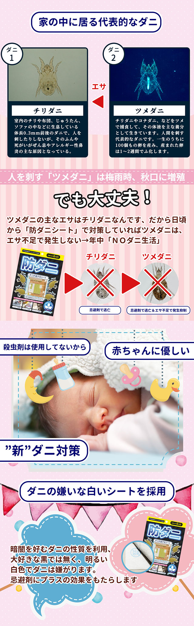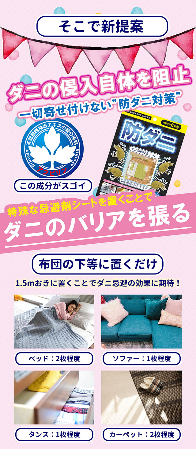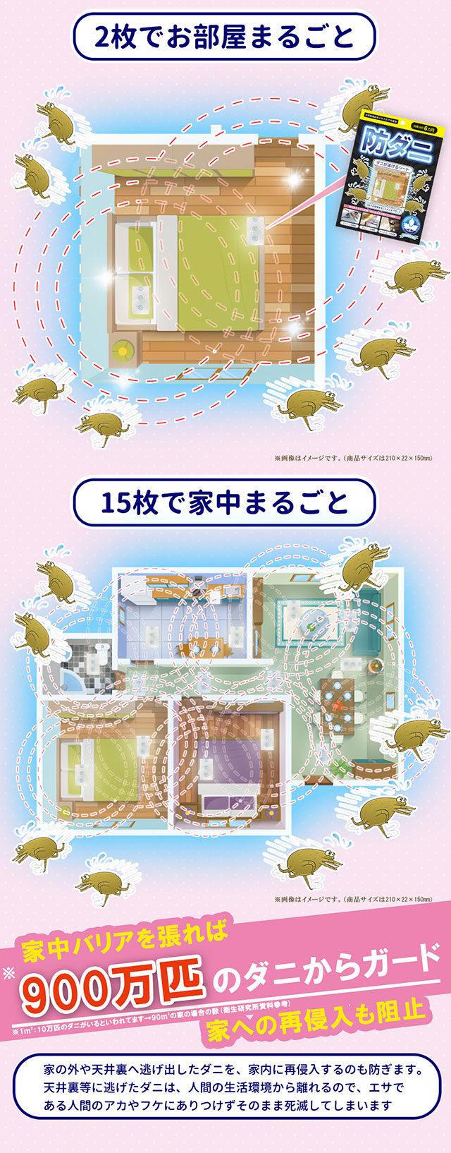 | ご使用方法 | ●気になる場所にシートを置いてください。●付属のシールに使用開始日や交換目安日を記入してシートに貼っておくと交換日がわかるので便利です。●残ったシートは密閉して、湿気の少ない直射日光の当たらない場所に保管してください。●ダニをよせつけない効果はシートに近接している場所です。布団や衣類の間に複数枚シートを入れると効果的です。 |
