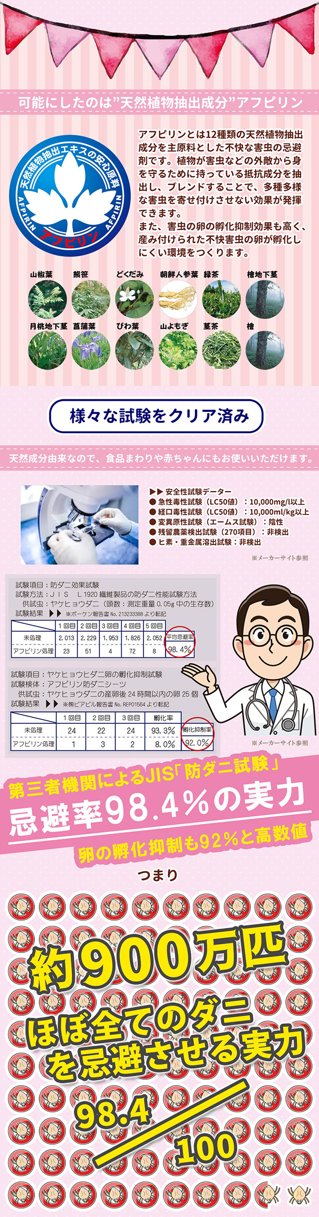 | 使用上の注意 | ●本製品はダニの駆除を目的としたものではありません。●使用環境、条件等により効果には差があります。●本製品を生体に使用したり、本製品の上に直に寝たりしないでください。●床などに使用したシートに乗ると滑ることがありますので十分ご注意ください。●直射日光が当たる場所でのご使用、保管はしないでください。効果が落ちる場合があります。●乳幼児の手の届く所に置かないでください。●防ダニ成分は人体には無害ですが、万一目や口に入った場合は必要に応じて医師の診断を受けてください。●火気の近くや高温になる場所、濡れる場所ではご使用、保管しないでください。●他の防虫剤とは併用しないでください。●シートは洗わないでください。湿った時は陰干しをして乾燥させてからご使用ください。●乾燥機やアイロンは使用しないでください。●著しく破損したり、汚れたものは使用しないでください。●シートは使い捨てです。再利用はできません。●用途以外の目的では使用しないでください。 |