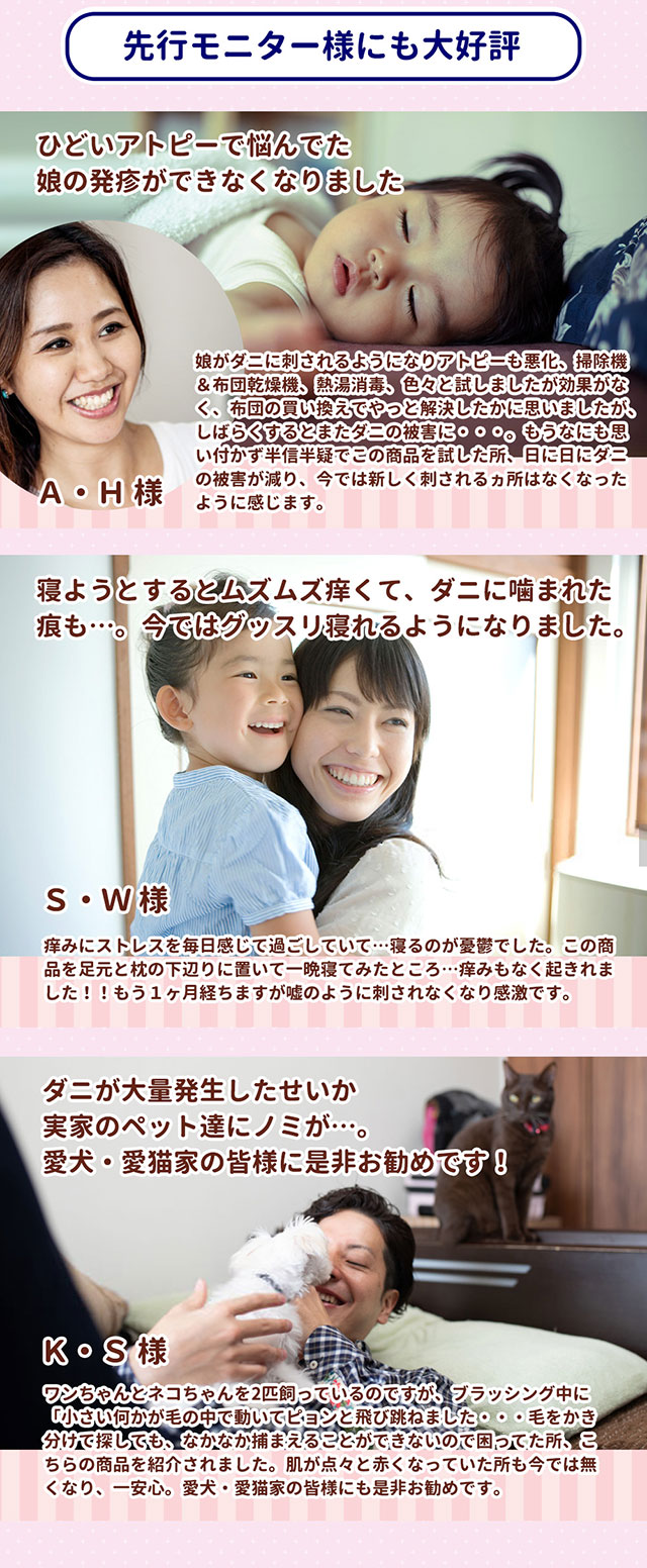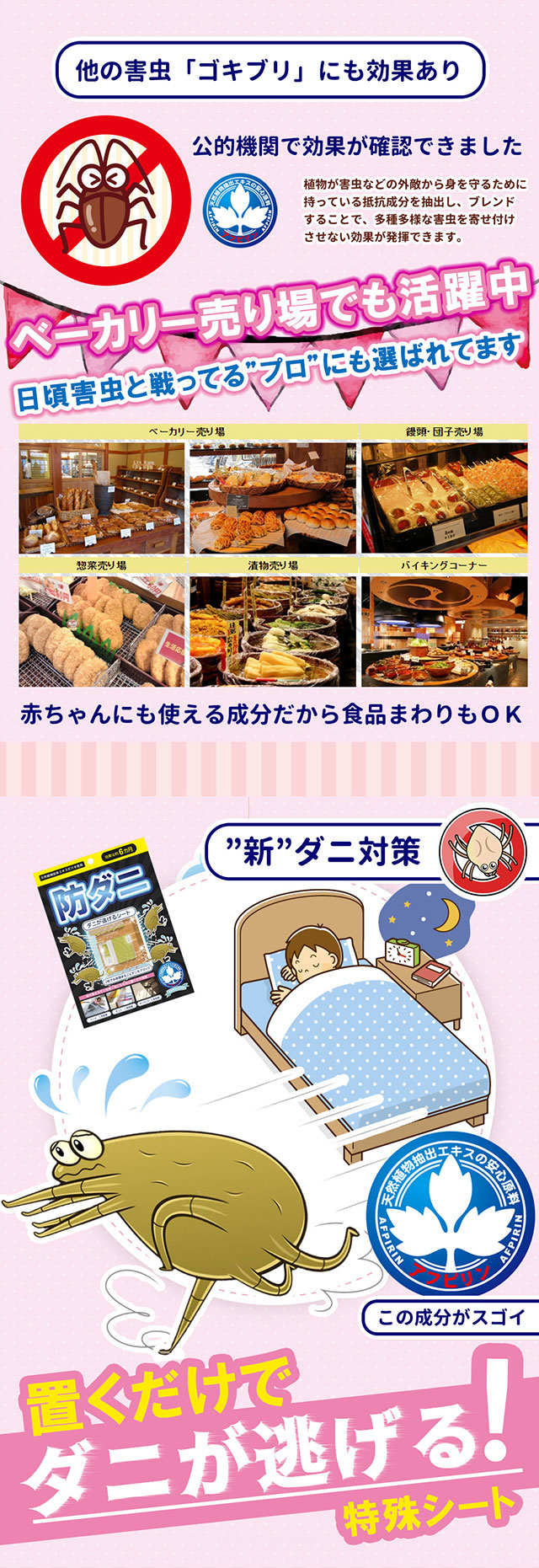 | 商品特徴 | ●気になる所に置くだけで簡単に防ダニができます。●家中で使えます。(例:押し入れ、布団・ベッド、タンスの中、カーペット・コタツの下、枕・クッション、畳・収納BOX) |