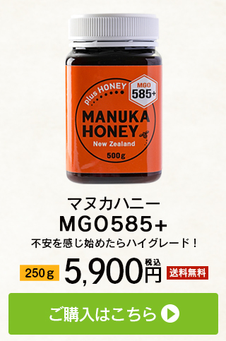 MGO(食物メチルグリオキサール)は、マヌカハニーに含まれる天然成分で、品質の目安として国際的に使用されています。MGO585以上とは、1kgあたり585mg以上のMGOが含まれていることを示します。