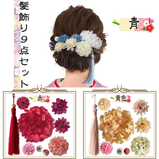 髪飾り 9点セット 房飾りつき シルクフラワー 房つき 成人式 卒業式 結婚式 七五三 青 赤 黄色