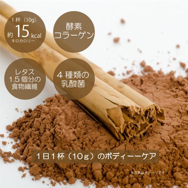 難消化性デキストリン(韓国)、 ココアパウダー、 酵素パウダー、ミルクパウダー、コラーゲン 乳酸菌(EC-12、アシドフェルス、ラクリス)、 ビフィズス菌、/甘味料(エリスリトール、ステビア)、香料 |