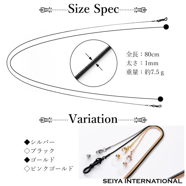 明るい輝きが特徴的なステンレス製メガネチェーンは、紛失防止の目的だけでなく、ワンポイントのファッションアイテムとしても活躍します。韓国ではマスクストラップはマスクに付けておしゃれに楽しめるアクセサリーとしてとても人気があります。シルバー・ゴールド・ピンクゴールド・ブラックの4色ご用意しておりますので、お好みに合わせてお選びください。