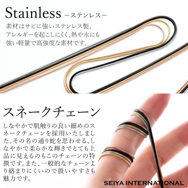 しなやかで肌触りの良い細めのスネークチェーンを採用いたしました。その名の通り蛇を思わせる、しなやかで柔らかな輝きでとても上品に見えるのもこのチェーンの特徴です。また、一般的なチェーンより絡まりにくいので扱いやすさも魅力です。材質はステンレスを採用しました。ステンレスは金属の中でもアレルギー性が極めて低い素材です。耐食性がとても高いので水や汗によるサビ、変色に強く、硬い金属なので傷がつきにくく、変形しにくいです。水にぬれた時も乾いたタオルでさっと拭くだけでお手入れも簡単です。