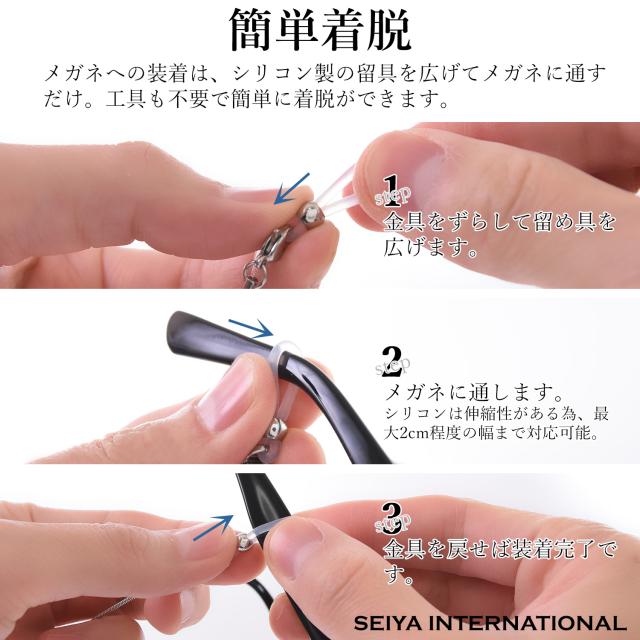 メガネに取り付けての使用以外にも、両端のシリコンパーツを外してカニカン留め具を使用することでマスクストラップとしてマスクにも取り付けることが可能です。外出時にマスクを外した際に置き場所に困る事はありませんか。このチェーンをマスクに付けていただくことで、外した際に首からぶら下げることができ、置き場所の心配も不要で、着脱も簡単でお手軽です。また、片側のシリコンパーツを外せばおしゃれなネックレスとしても使用していただけます。