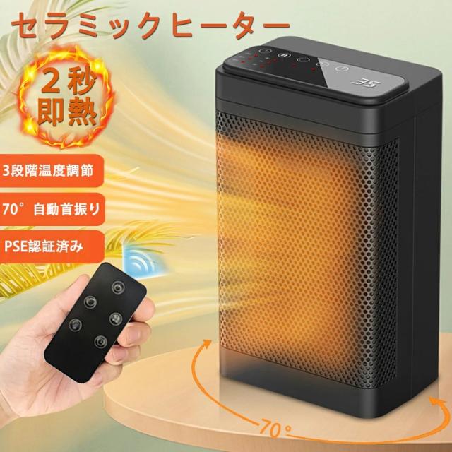 ヒーター セラミックヒーター 1500W 2秒速暖 ファンヒーター 3段階温度調整 タイマーOFF 転倒自動オフ 過熱保護 タイマー機能 リモコン付き 卓上 足元 取扱説明書付き PSE認証済み