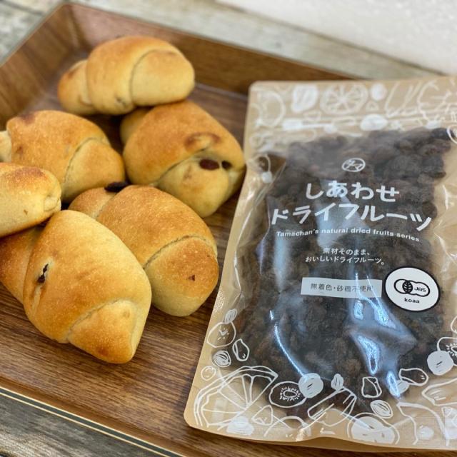 焼きたて玄米パンをそのまま急速冷凍しました。美味しさ保ったまま、ご家庭で自然解凍すると焼きたての風味が戻ります。タマチャンショップのカルフォルニア産オーガニック房干しトンプソンレーズンを使用した玄米レーズンロール。
