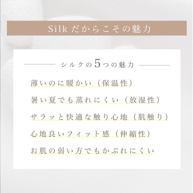 | 素材 | シルク100%糸(別途ゴム糸使用:ナイロン・ポリウレタン) |