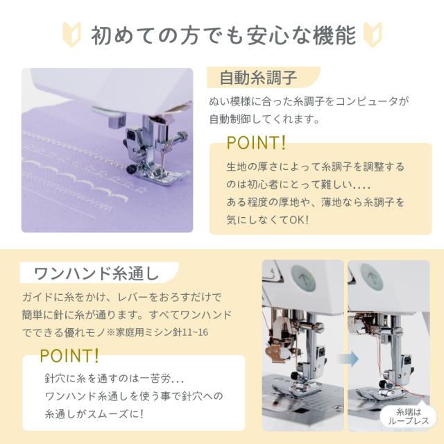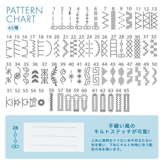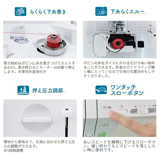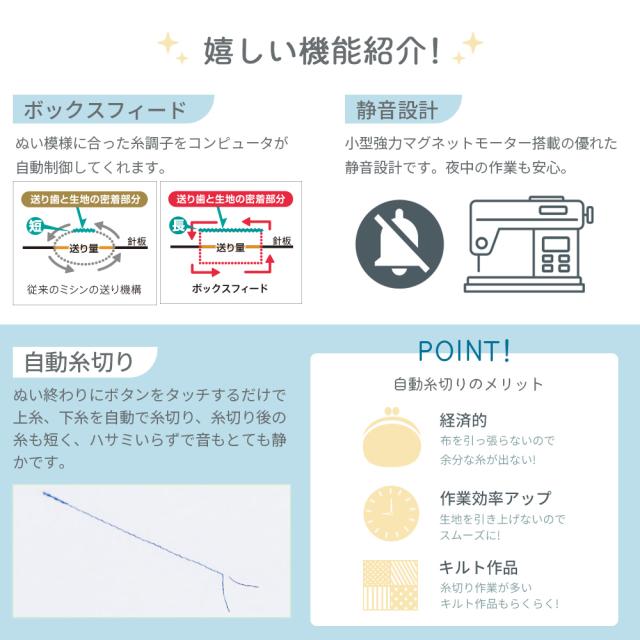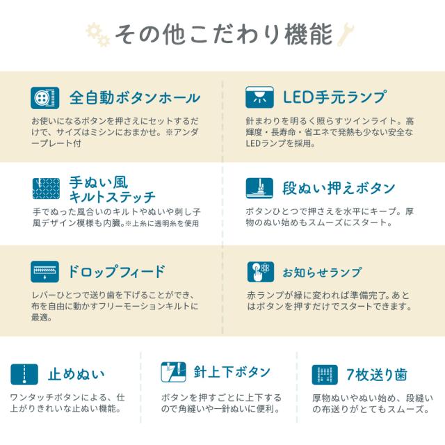 ボックスフィード、ワンハンド糸通し、液晶画面、押え圧力調節、自動糸切り、下糸らくスルー、らくらく下糸巻き、コンピューター式自動糸調子、静音設計、お知らせランプ、縫い模様65種類、全自動ボタンホール、LED手元ランプ、手縫い風キルトステッチ、コードリール、ドロップフィード、止縫い、段縫い押えボタン、ワンタッチスローボタン、針上下ボタン、7枚送り歯