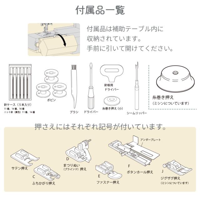 ジグザグ押え、ボタンホール押さえ、ファスナー押え、まつりぬい押え、ふちかがり押え、サテン押え、針ケース、ボビン、ブラシ、ドライバー、針板用ドライバー、糸巻き押え(大)、糸巻き押え(小)シームリッパー