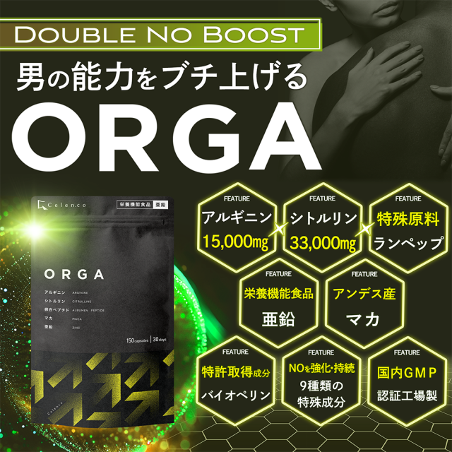 ●【DOUBLE NO BOOST】ORGA(オルガ)は、男性を対象とし、2つのNOシステムでめぐりをサポートするNOサプリメント。