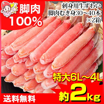 かに 蟹 ずわいがに 生ずわいがに 【刺身用】特大6L〜4L生ずわい脚肉むき身30〜40本(約1kg)×2箱/ むき身 カット済み ポーション お刺身 かに刺し 生食可 生食用 かに鍋 蟹鍋 かにしゃぶ 大型 おすすめ ギフト 贈答 お歳暮