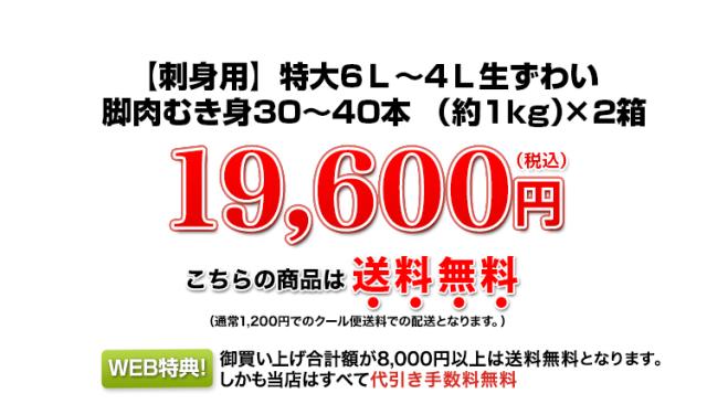 ●名称/【刺身用】特大6L〜4L生ずわい脚肉むき身30〜40本(約1kg)×2箱