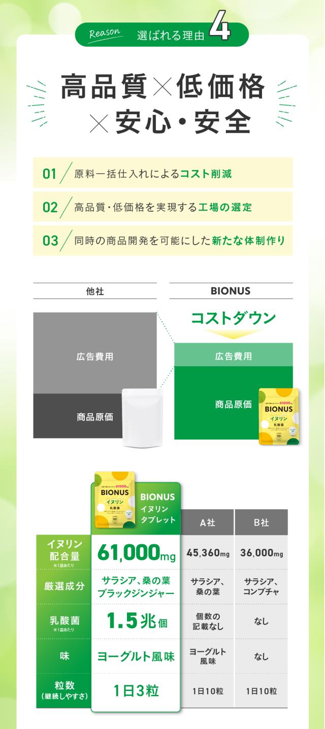 | 原材料 | イヌリン(タイ製造)、還元パラチノース、乳酸菌粉末(殺菌)、菊芋エキス末、食物繊維、ガラクトオリゴ糖粉末、緑茶菌培養エキス末、ビフィズス菌末、サラシアエキス末、桑葉エキス末、植物発酵エキス末、難消化性デキストリン、ドロマイト、ブラックジンジャーエキス末/セルロース、HPC、ステアリン酸Ca、酸味料(クエン酸)、微粒酸化ケイ素、香料、V.C、ナイアシン、V.E、パントテン酸Ca、V.B1、V.B6、V.A、V.B2、葉酸、V.D、V.B12(一部に大豆を含む) |