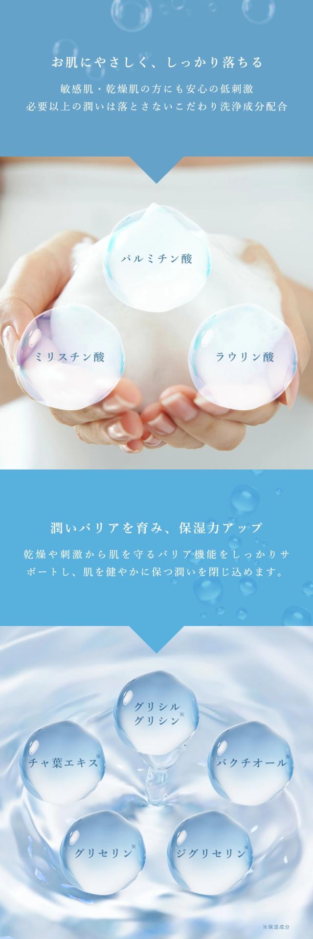 | 水、ジグリセリン、ミリスチン酸、パルミチン酸、水酸化K、グリセリン、ラウリルベタイン、ラウリン酸、アゼライン酸、アゼロイルジグリシンK、グリシルグリシン、テトラヘキシルデカン酸アスコルビル、ジパルミチン酸アスコルビル、バクチオール、ツボクサ葉/茎エキス、チャ葉エキス、ティーツリー葉油、カニナバラ果実油、トコフェロール、ステアリン酸グリセリル(SE)、ポリクオタニウム-7、塩化Na、EDTA-2Na、BG、フェノキシエタノール