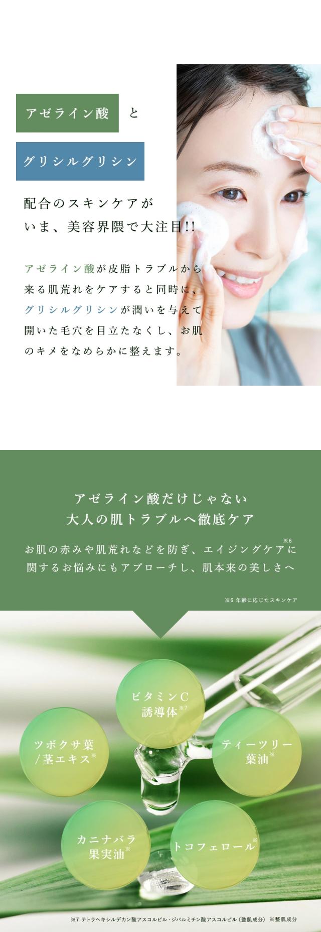 純粋アゼライン酸とアゼライン酸誘導体をWで配合。肌のキメを整えるグリシルグリシンも配合し、濃密できめ細かな泡が毛穴の汚れなども包み込んで落とす洗顔料です。うるおい感は残しながらも、くすみの原因となる汚れや古い角質をオフ。皮脂のバランスをニキビや毛穴の悩みの元となる毛穴汚れをすっきり取り去り、なめらかでうるおい感のある、クリアな肌へ導きます。 |