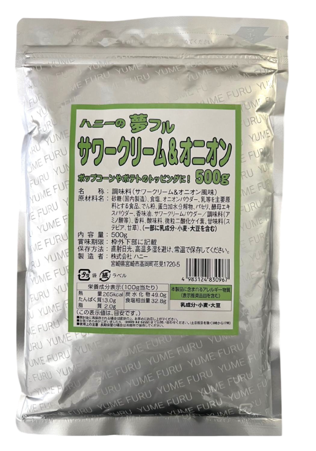 原材料名:砂糖(国内製造)、食塩、オニオンパウダー、乳等を主要原料とする食品、でん粉、蛋白加水分解物、 パセリ、酵母エキスパウダー、香味油、サワークリームパウダー/調味料(アミノ酸等)、香料、酸味料、微粒二酸化ケイ素、甘味料(ステビア、甘 草) ※アレルギー物質(一部に乳成分・小麦・大豆を含む)