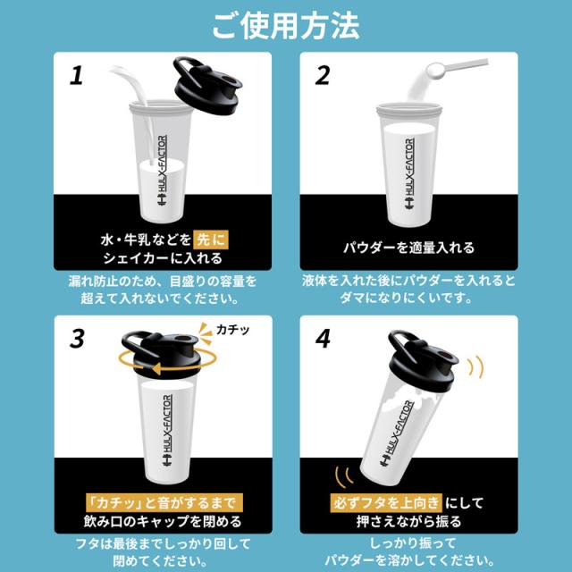 | 1.シェイカーに水や牛乳などを入れます。 2.プロテインやEAA、BCAA、グルタミン、クレアチンなどの粉末を入れます。 3.蓋をしっかりと閉めます。 4.シェイカーをよく振って溶かします。 ※軽く蓋を押さえてください。振って溶かした後は速やかにお召し上がりください。 |
