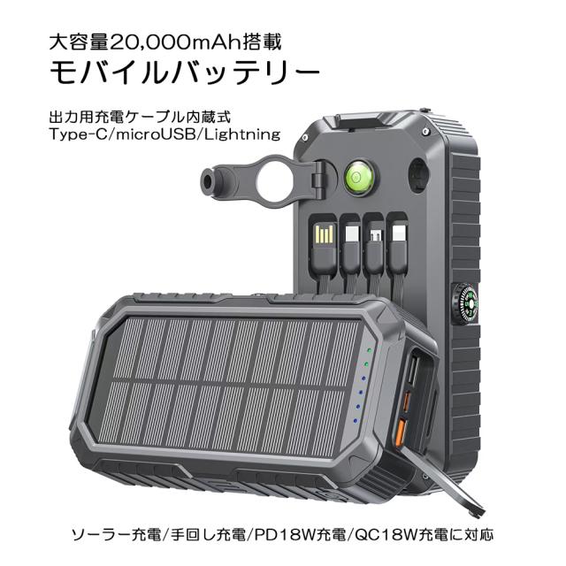 モバイルバッテリー 20000mAh 最大6台同時充電 急速充電 PD20W QC18W ソーラー充電 手回し充電 ケーブル内蔵 PSE適合