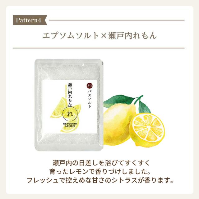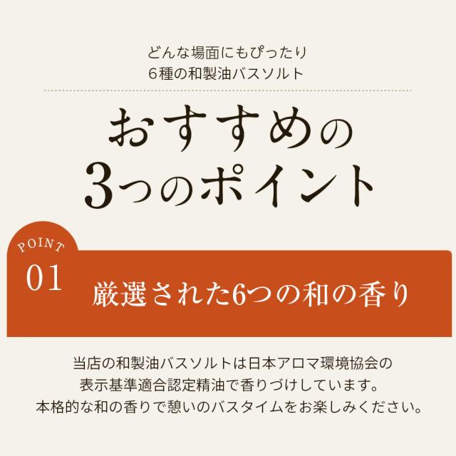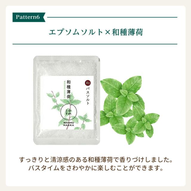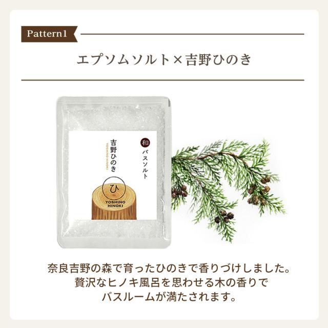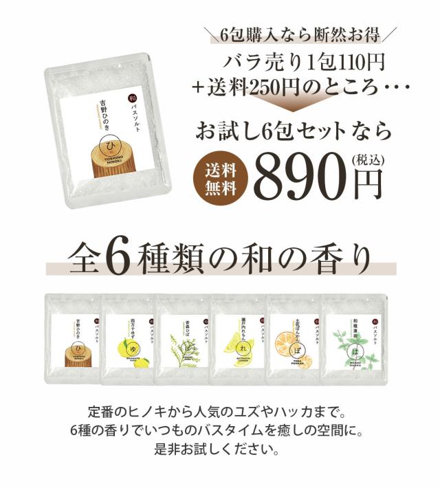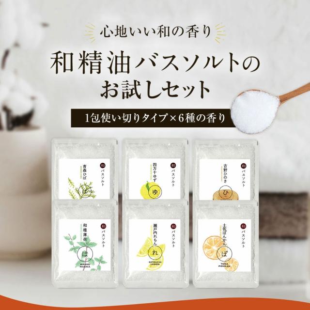 【特徴】6種類の和精油バスソルトを試せる6パッケージセット。プチギフトにもおすすめです。【内容量】[吉野ひのき]40g×1包・[四万十ゆず]40g×1包・[青森ひば]40g×1包・[瀬戸内れもん]40g×1包・[土佐ぽんかん]40g×1包・[和種薄荷]40g×1包 計6包【原材料】[エプソム&吉野ひのき]硫酸Mg、ヒノキ木油、[エプソム&四万十ゆず]硫酸Mg、ユズ果皮油、[エプソム&青森ひば]硫酸Mg、アスナロ木油、[エプソム&瀬戸内れもん]硫酸Mg、レモン果皮油、[エプソム&土佐ぽんかん]硫酸Mg、マンダリンオレンジ果皮油、[エプソム&和種薄荷]硫酸Mg、ハッカ葉油