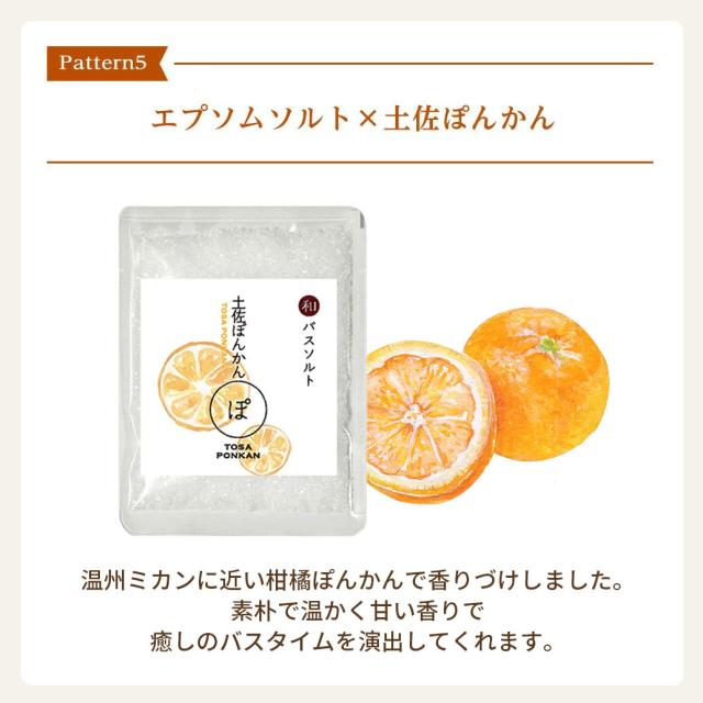 【原材料】[エプソム&吉野ひのき]硫酸Mg、ヒノキ木油、[エプソム&四万十ゆず]硫酸Mg、ユズ果皮油、[エプソム&青森ひば]硫酸Mg、アスナロ木油、[エプソム&瀬戸内れもん]硫酸Mg、レモン果皮油、[エプソム&土佐ぽんかん]硫酸Mg、マンダリンオレンジ果皮油、[エプソム&和種薄荷]硫酸Mg、ハッカ葉油