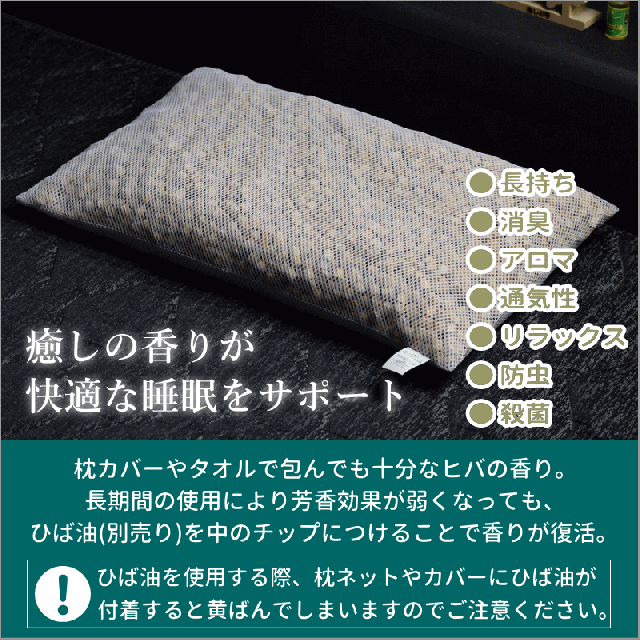 | 使用法 | 枕カバーまたはタオルを巻いてご利用ください ※青森ヒバがあなたの睡眠中支えてほしい場所をしっかりキープしてくれます。 香りが弱くなり始めたらヒバ油かヒバ水を吹き掛ければ何度でも復活します。 ※ひば小玉は陰干しをしてください(水や洗剤で洗わないでください) |