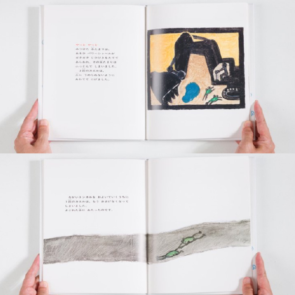 池を追われた2匹のカエル。高速道路やゴルフ場。水たまりを求め、あらゆる場所に行ってみますが、安心できる居場所はありません。2匹の運命はどうなるのでしょうか…。
