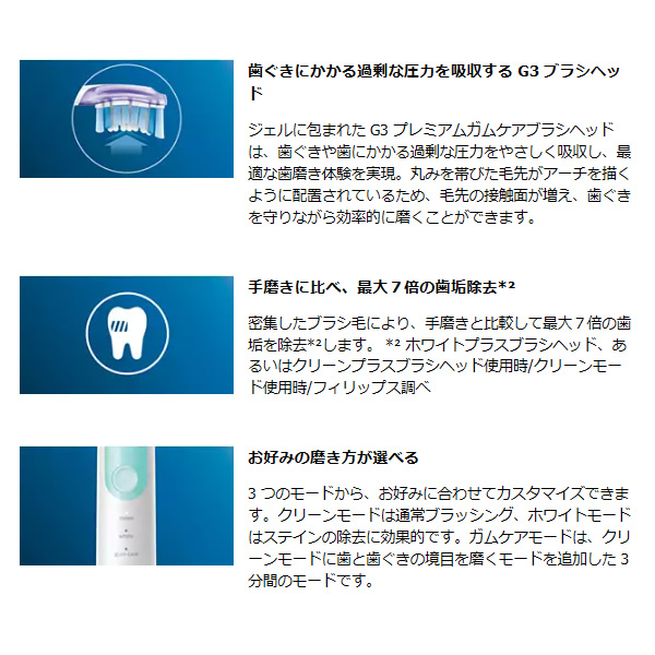 美しい歯と歯ぐきを、この一本で守る 過圧防止センサーで歯ぐきにやさしく。 ■電源 対応電圧 AC100V-240V 50/60Hz(海外でも使用可能) ■使用時間 約 2 週間 ■バッテリー 充電式 ■バッテリーの種類 リチウムイオンバッテリー ■色 ホワイトミント ■内容・付属品 ハンドル:プロテクトクリーン 1 本 ブラシヘッド:G3 プレミアムガムケア 1 本 / C2 クリーンプラス 1 本 充電器:1 ※記載は商品仕様の一部です。仕様説明不足等の理由での返品はできません。特に適合等は必ずご確認ください。