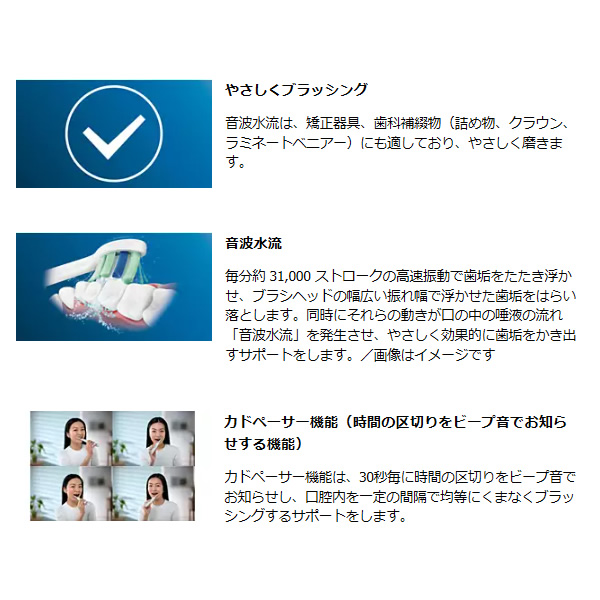 毎分約 31,000 ストロークの高速振動で歯垢をたたき浮かせ、ブラシヘッドの幅広い振れ幅で浮かせた歯垢をはらい落とします。同時にそれらの動きが口の中の唾液の流れ「音波水流」を発生させ、やさしく効果的に歯垢をかき出すサポートをします。/画像はイメージです