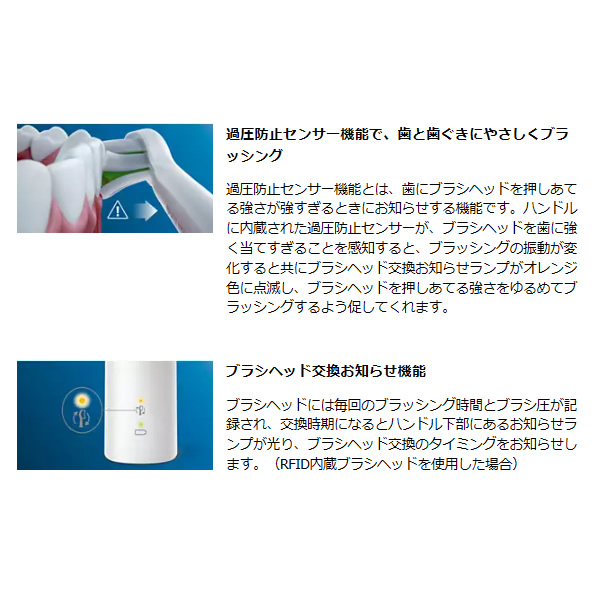過圧防止センサー機能とは、歯にブラシヘッドを押しあてる強さが強すぎるときにお知らせする機能です。ハンドルに内蔵された過圧防止センサーが、ブラシヘッドを歯に強く当てすぎることを感知すると、ブラッシングの振動が変化すると共にブラシヘッド交換お知らせランプがオレンジ色に点滅し、ブラシヘッドを押しあてる強さをゆるめてブラッシングするよう促してくれます。
