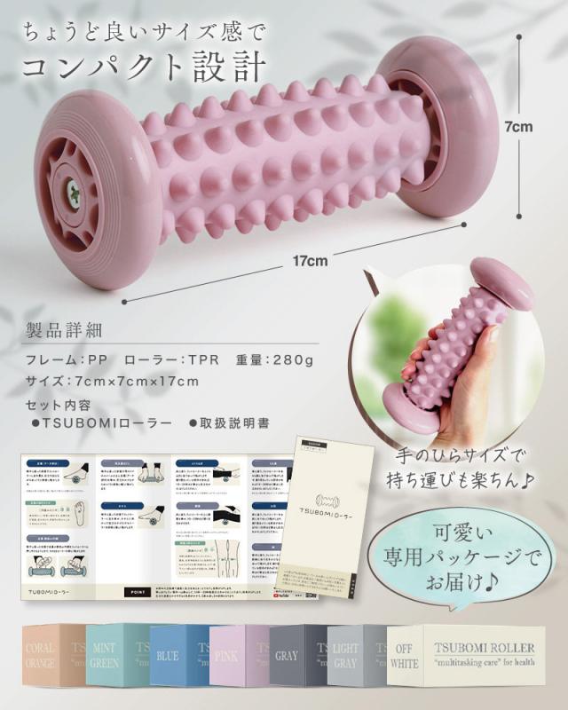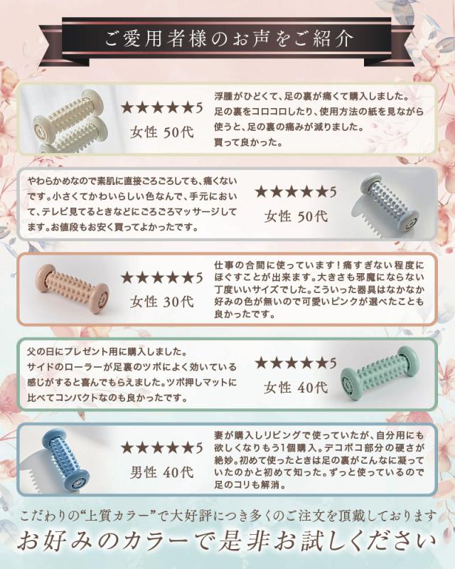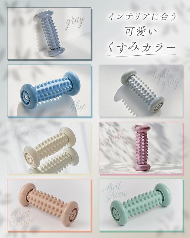 - くすみカラーでパッケージまで可愛くて、届いた時に嬉しかったです。 足裏やふくらはぎなど気になる所をコロコロするだけなので、毎日お風呂上がりに手軽にマッサージできます。 いた気持ちいい刺激で疲れが取れま...