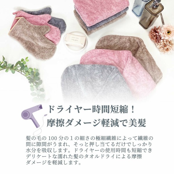髪の毛の100分の1の極細繊維が、水分をすばやくキャッチ そっと押し当てるだけでしっかり吸水し、ドライヤー時間を短縮 濡れた髪への摩擦ダメージを抑え、デリケートな髪もやさしく守ります |