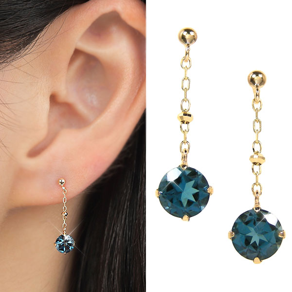[材質]K10イエローゴールド[石]天然トパーズ(ロンドンブルートパーズ)5mm[縦・横]約19.4×5.5mm[ポスト]太さ0.65mm,長さ10mm[キャッチ]K10製シリコン付ダブルロック[全体重量]ペアで約0.6g