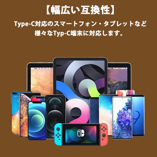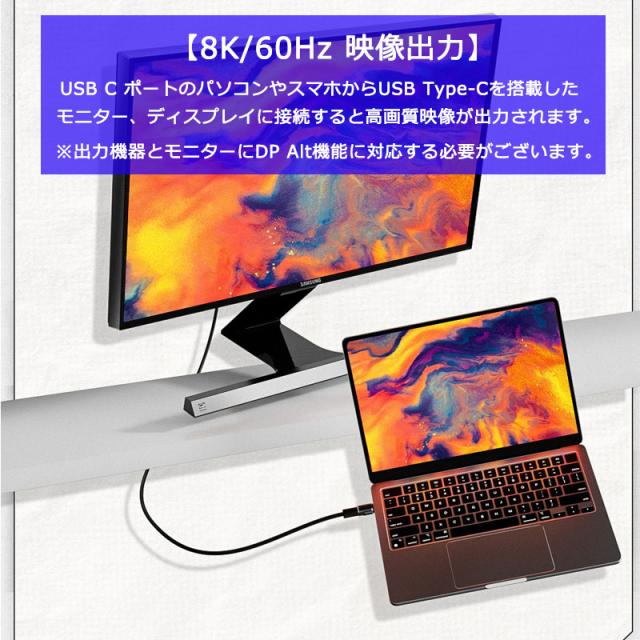 【240W PD充電】 最大240Wまでの電力を供給できるType-C to Type-C コネクターです。 幅広い互換性でスマートフォン・タブレット・ゲーム機などの様々なUSB-Cデバイスに充電供給が可能なケーブルです。 ※PD充電を利用するには接続する端末・ケーブルがPD充電に対応している必要がございます。 【80Gbps高速データ転送】 80Gbpsでの高速データ転送が可能です。転送時間を大幅に節約できます。 ※接続ケーブルもデータ転送に対応していないと、データ転送することができません。 ※OTG機能非対応:イヤホン、車載製品、USBメモリ、SDカード、マウス、キーボード等には対応しておりません。 【マグネット端子USB Cアダプター】 接続端子部分はマグネット着脱式で端子をスマホ充電口に挿しておけば、 日々の充電時のケーブルの抜き差しによるダメージが減り未然に故障や劣化を防ぎます。 【安心保護システム】 内蔵スマートチップ(E-Marker)搭載で過充電によるバッテリー損傷を防ぎ、より安全に安定した充電が可能です。 【8K@60Hz高解像度出力】 USB C ポートのパソコンやスマホからDP Alt機能を搭載したモニター、ディスプレイに接続すると高画質映像が出力されます。 ※出力機器とモニターにDP Alt機能に対応する必要がございます。 【幅広い互換性】 Type-Cポート搭載の様々なデバイスに対応しております。 iPhone15/16,USB-Cスマートフォン,Macbook Pro/Air,iPad,PC,タブレット,Switch |