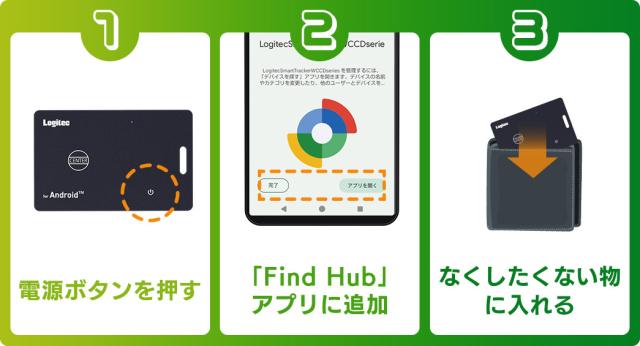 電源ボタンを押す > Android(TM)スマートフォン・タブレットの「Find Hub」アプリに登録 > 大切な荷物に付ける の3ステップのかんたん設定!位置情報はアプリからいつでも調べることができます。