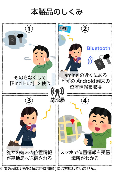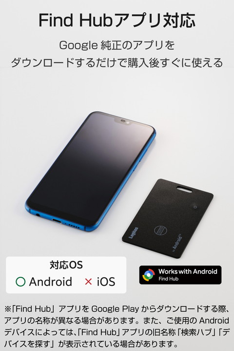 Android(TM)の「Find Hub」アプリから位置を確認!財布・かばんなど大切な荷物に付けて位置情報を追跡できるスマートトラッカーです。繰り返し使える充電式だから、いざというときの充電切れの心配がありません。わずか約1.7mmの薄さで財布に入れてもかさばらない超薄型タイプです。![]() ■Android(TM)スマートフォン・タブレットの「Find Hub」アプリから荷物のありかを探せるスマートトラッカーです。Google純正のアプリをダウンロードするだけで購入後すぐに使えて、鍵やかばんなど大切な荷物の紛失を防ぎます。 ■使い方はかんたん3ステップ!「電源ボタンを押す」「Androidスマートフォン・タブレットの『Find Hub』アプリに登録」「大切な荷物に入れておく」だけで完了です。位置情報はアプリからいつでも調べることができます。 ■カード型で薄さはわずか約1.7mm。財布やカードケース、かばんはもちろん、パスポートや荷物タグに挟んで使ってもかさばりません。 ■ワイヤレス充電対応の充電器を使用することで繰り返し使えます。3カ月を目安に充電してください。 ■QiまたはQi2対応充電器で充電できます。充電を行うことで、最高300回繰り返し使用可能です。20℃〜40℃の環境で充電することを推奨します。 ■※ワイヤレス充電器は付属しておりませんので、別途ご用意ください。 ■スマートトラッカー本体が鳴るアラーム機能付き。「Find Hub」アプリから「サウンドを再生」を選ぶとアラームが鳴って荷物のありかを確認できます。 ■本体のランプで、電源オン/オフや充電の状況を確認できます。 ■ホコリなどの侵入を防ぎ、激しい雨でも安心の、IP68の防塵・防水設計です。 ■※水没した状態でスマートトラッカーを使用・動作させることはできません。 ■位置情報や履歴は暗号化され、個人が特定されることはありません。プライバシーに配慮した設計です。 ■安心の技適マーク(TELEC)認証取得済み製品です。 ■※本製品はご自身の所持品にのみご使用ください。承諾を得ずに他者の位置情報を取得する行為は、日本の法律により禁止されています。 ■※本製品は航空機内で使用できない場合があります。ご搭乗前に利用する航空会社の預け入れ手荷物・機内持ち込み手荷物に関する規定をご確認ください。 ■※本製品はUWB(超広帯域無線)には対応しておりません。 ■※初期状態では少し湾曲している場合がありますが、製品の仕様に影響はありません。 ■※本製品はNFC機能を利用した紛失モードには対応していません。 ■※「Find Hub」アプリはデバイス購入時にはインストールされていない場合があります。その際はGoogle Playからダウンロードしてください。 ■※「Find Hub」アプリをGoogle Playからダウンロードする際、アプリの名称が異なる場合があります。また、ご使用のAndroidデバイスによっては、「Find Hub」アプリの旧名称「検索ハブ」 「デバイスを探す」が表示されている場合があります。 ■※「Find Hub」アプリをご使用の際は、Androidを最新バージョンにアップデートされることを推奨します。 ![]() ■対応OS(Android):Android 15/14/13/12/11/10/9 ※2025年4月時点 ■対応機種(Android):Android端末 ■外形寸法:幅約85.5mm×奥行約54mm×高さ約1.7mm ■重量:約11g ■保証期間:1年間 ■動作時環境条件(温度):5℃〜35℃ ■動作時環境条件(相対湿度):20%〜80% (ただし、結露なきこと) ■環境条件(保管時温度):-10〜50℃ ■環境条件(保管時湿度):10%〜90% (ただし、結露なきこと) ■充電時間:約7時間 ※20℃〜35℃の環境で充電することを推奨します。 ■連続待機時間:最大6カ月 ■繰り返し充電回数:最高300回 ■充電方式:ワイヤレス充電 ※QiまたはQi2規格のワイヤレス充電器に対応しております。※本製品にワイヤレス充電器は同梱しておりません。 ■防塵・防水性能(保護等級):IP68 ■音量:アラーム音量 60db ■カラー:ブラック |