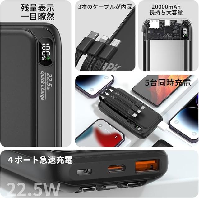 モバイルバッテリー 20000mAh 大容量 22.5w急速充電 ケーブル内蔵 LED残量 機内持ち込み可能 持ち運び便利 スマホ 充電器 iPhone/Android 対応 軽量 PSE 残量表示