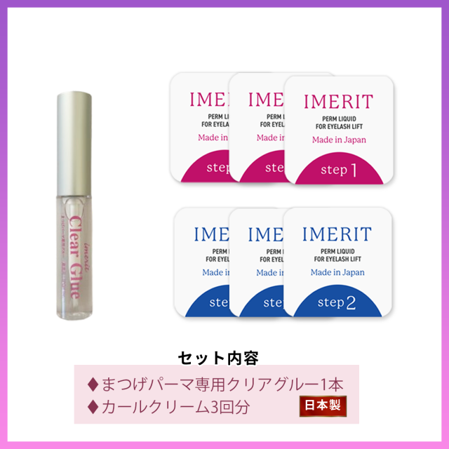 〔IMERIT〕5分でかかる! エクステ つけまつ毛用 日本製 低刺激パウチパーマクリーム液(3回分) /高粘着クリアグルー セルフまつげパーマ