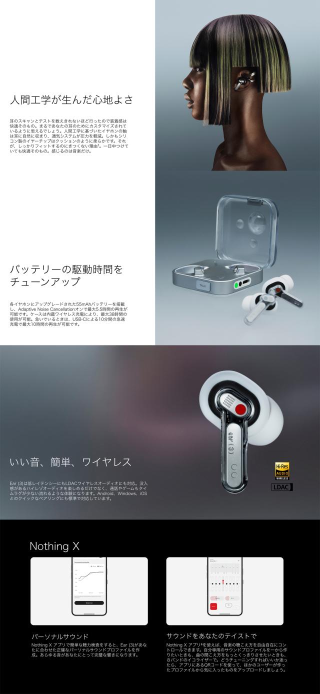 【冬SALE ポイント高還元】 新発売 日本正規代理店 Nothing ear(3) ハイレゾ ワイヤレスイヤホン 24bit LDACワイヤレス対応 AIによる環境ノイズキャンセリング 45dBアダプティブANC スーパーマイク 最長38時間使用 ワイヤレス充電 デュアル接続