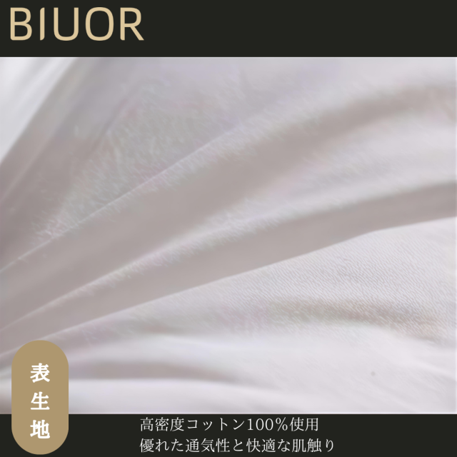 表面は肌にやさしい高密度コットン、中間層には低刺激・高耐久のポリエステル綿を使用し、羽根のごろつきを軽減。敏感肌の方にも安心です。