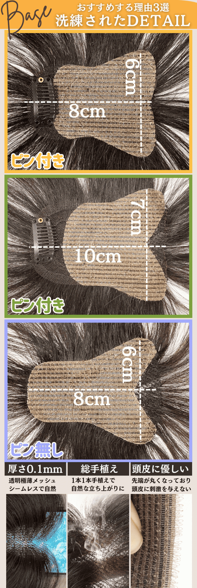 熟練の職人がひとつひとつ手縫いで植毛し、毛穴の質感まで細かく表現。人工的な不自然さがなく、まるで地毛が生えているかのような仕上がりに 機械では再現できない繊細な技術で、髪の流れや毛の立ち上がりまで自然にデザイン。風に揺れても違和感のない、美しいナチュラルスタイルを叶えます |
