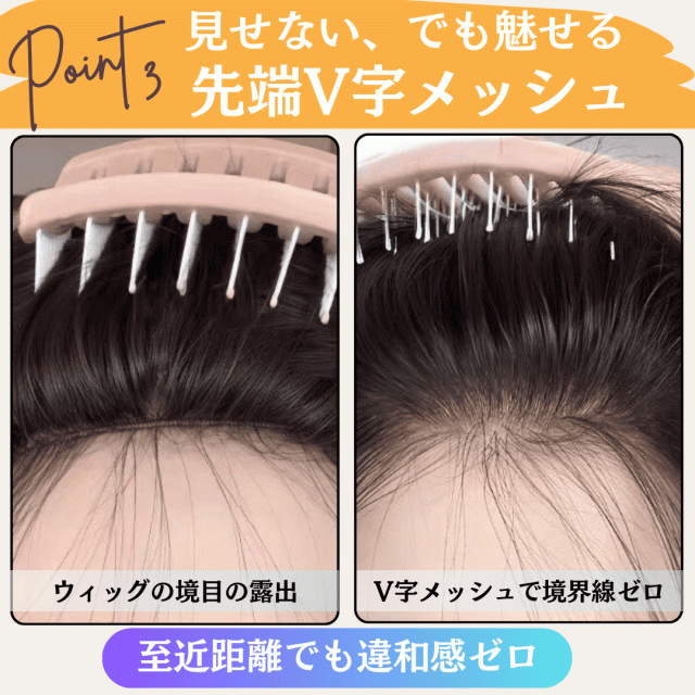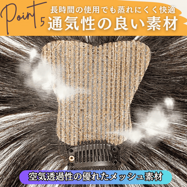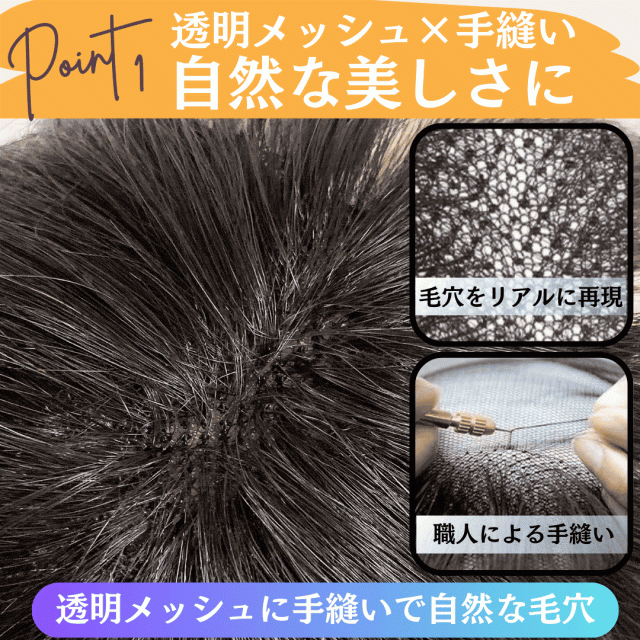 | 透明メッシュで馴染む自然な仕上がり | 肌に溶け込むようなメッシュ素材を使用。どの角度から見ても地肌が透けて見えるため、まるで自分の髪のように自然な印象を演出 |