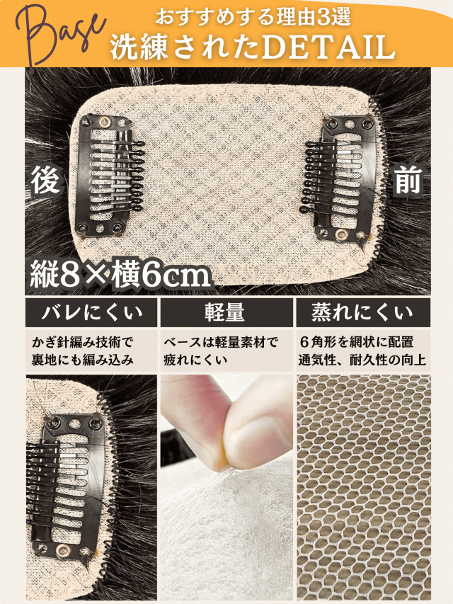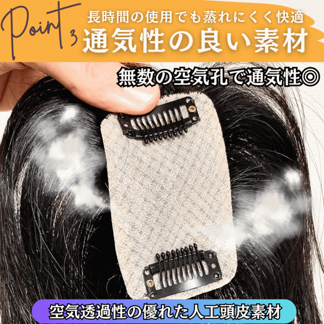| 特徴2 | 人工頭皮ネットを用いている為、空気透過性がとても良く快適。またあらゆる頭の形にフィットしより自然なつけ心地を実現 |