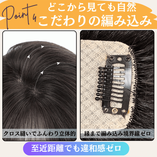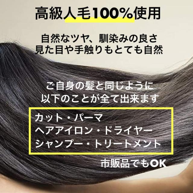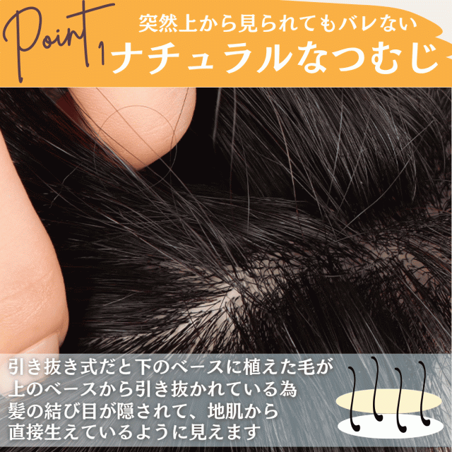| 特徴1 | 植毛方法にもこだわり、二重構造&引き抜き式を採用。職人による総手植えなため、分け目も自由自在で立体的な髪型に |