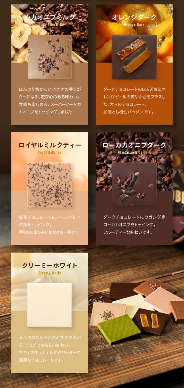 チョコレート(国内製造)、ココアバター、カカオニブ加工品(カカオニブ、植物油脂)/乳化剤、香料、着色料(カロチン)、(一部に乳成分・大豆を含む)