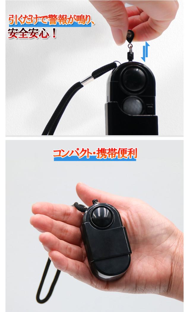 ・さらにストラップ部分を引き抜いてもアラームが鳴るので、夜道を歩く際や、お子様の防犯ブザーとしても活躍します。